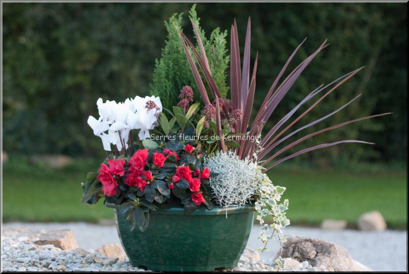 Pour la Toussaint, grand choix de compositions variées, chrysanthèmes, cyclamens, azalées, violas, bruyères